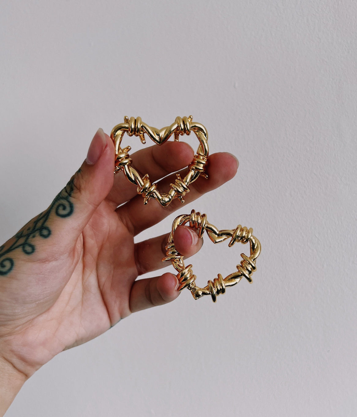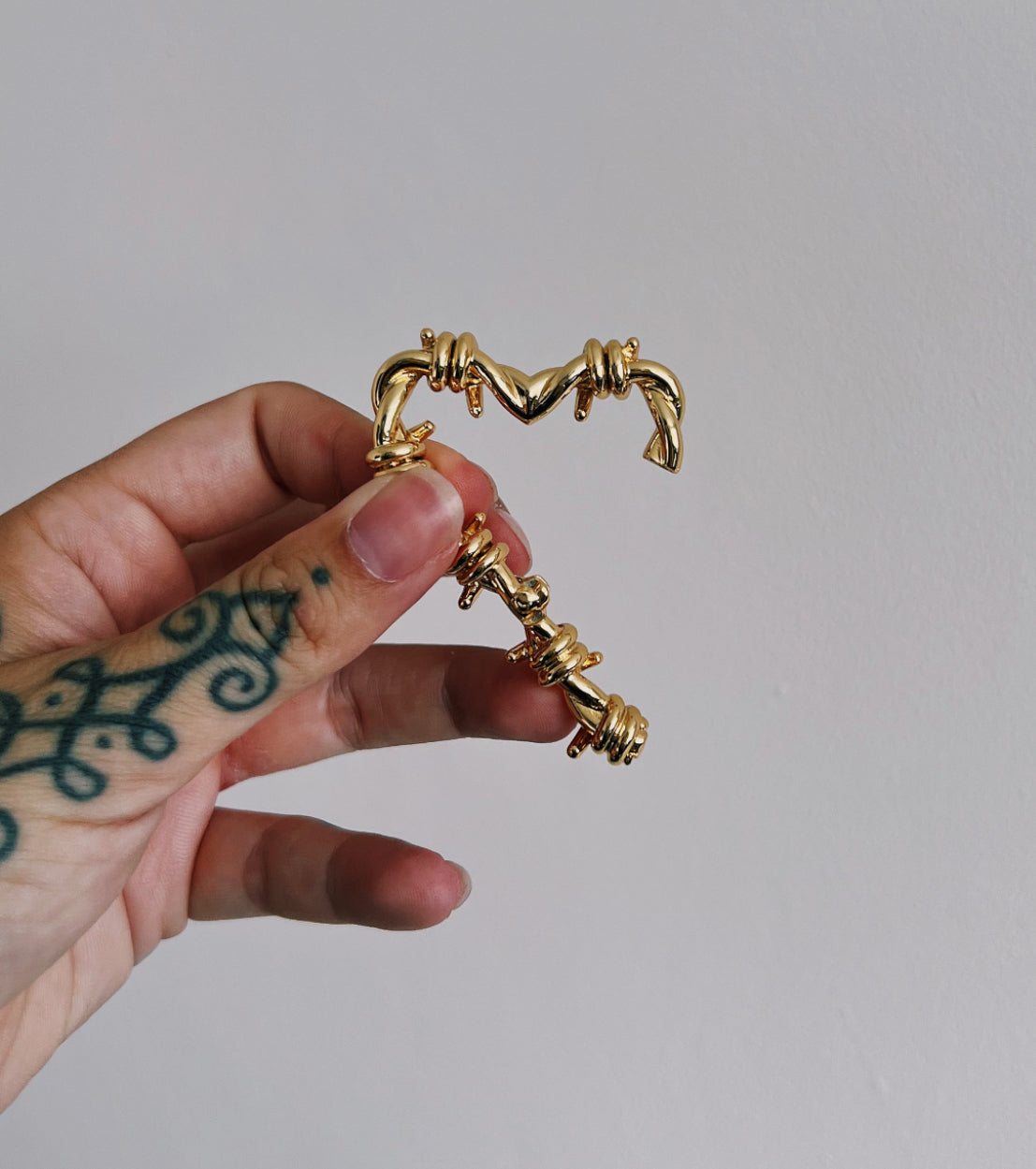 Add an edgy touch to your piercing collection with our Barbed Wire Hangers. These heart-shaped weights are perfect for 4mm+ stretched piercings and come in gold or silver. Measuring at 44mmx40mm and weighing 26g each, these are the coolest weights ever!